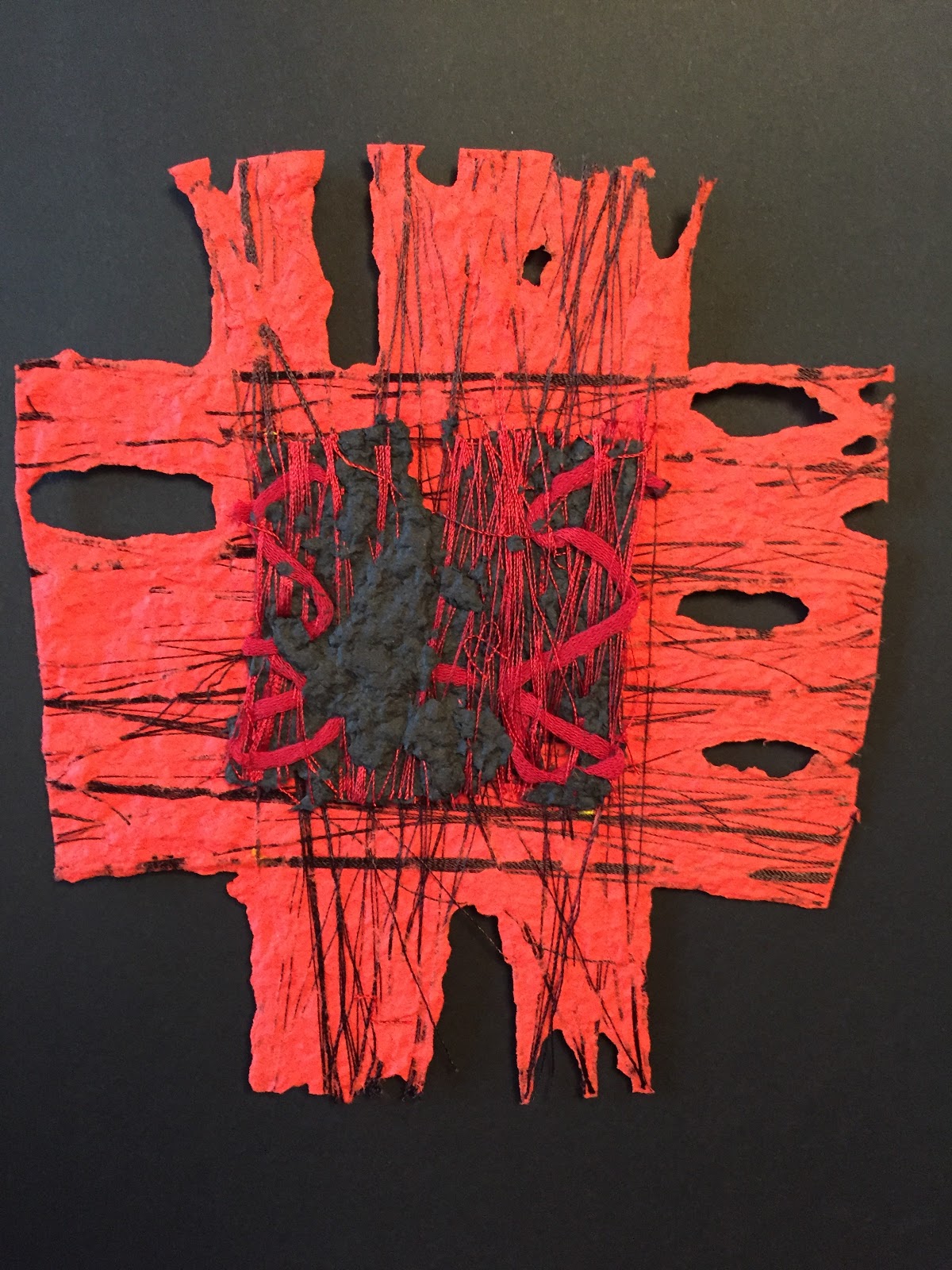 - row 1+2: weaving wit strips of torn black fabric, stitched with fly and cross stitch
